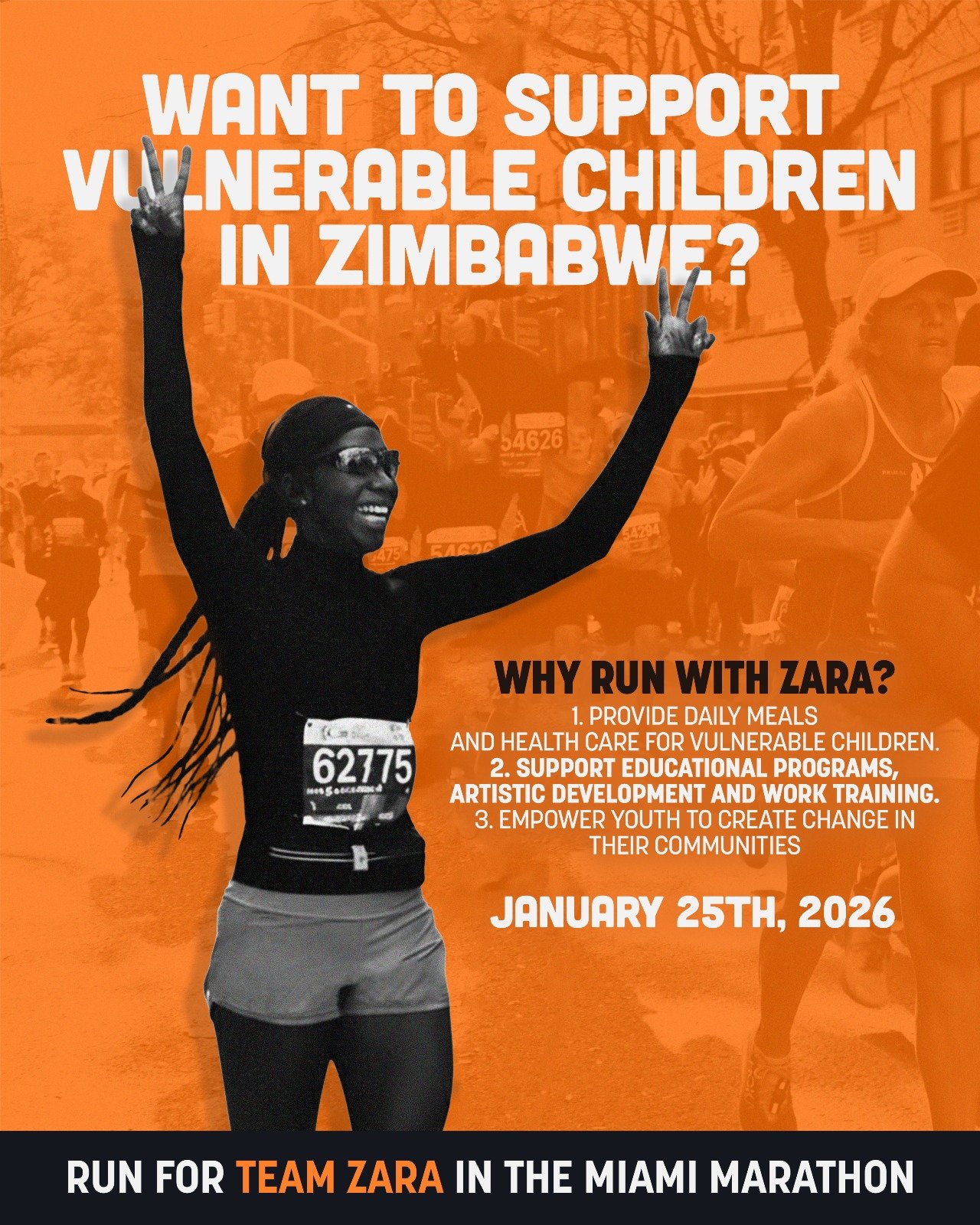 Our runners in Miami pledge to raise $1,500 each, with every dollar going directly to support Zara’s operations and programs.